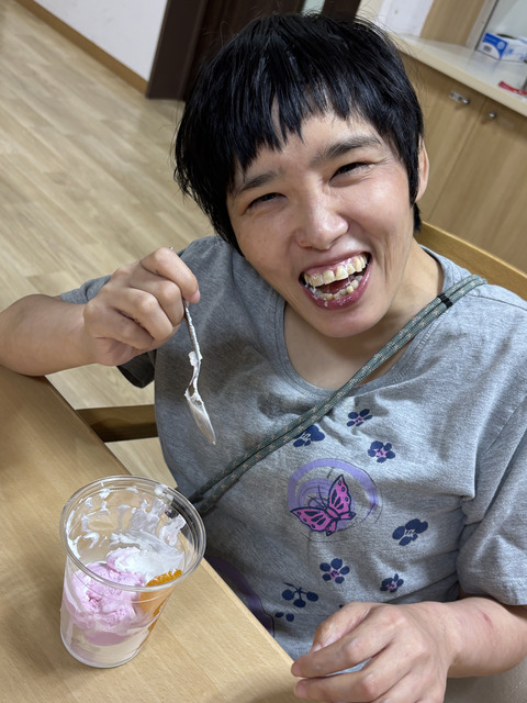 普段食べる事の少ないアイスの盛り合わせを食べて満面の笑みです。