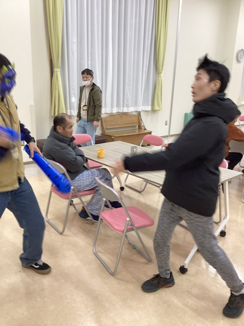 鬼に扮した職員が突然現れて、豆を使い利用者さんに退治していただく。といったことを行いました!